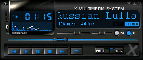 Рис. 15.29. XPlayCD В отличие от CD-проигрывателя она рассчитана на стерео-записи: две полоски рядом с изображением динамика позволяют отдельно регулировать громкость звука в правой и левой колонках (щелкайте мышкой по полоске или справа от нее). Других преимуществ у XPlayCD по сравнению с CD-проигрывателем я не увидел. Как CD проигрыватель, так и XPlayCD позволяют только прослушивать аудио-записи в том формате, который используется на CD-ROM. Если же вы хотите воспроизвести какой-либо файл формата MP3, получившего большое распространение в Интернете, вам надо воспользоваться программой xmms — X MultiMedia System (которая до 10 июня 1999 г. называлась X11Amp). Последняя устанавливается вместе с KDE, а по виду и возможностям очень напоминает (рис. 15.30) известный Windows Amplifier, или WinAmp. Версия 1.2.4, которая установилась у меня из дистрибутива Red Hat CE 7.1, была довольно капризна, но после того как я скачал (с сайта http://www.xmms.org) и установил версию 1.2.5, программа начала работать вполне устойчиво.