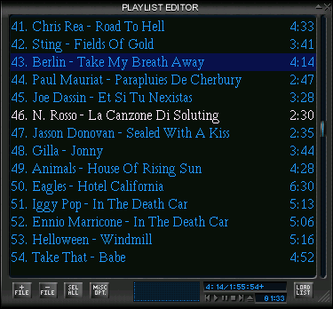 Рядом с буквами находится панель визуализации, в которой отображается время воспроизведения (либо прошедшее, либо оставшееся, в зависимости от настройки) и спектрограмма мелодии (вид которой тоже можно настроить). Под названием программы находится панель, в которой во время воспроизведения бегущей строкой отображается название воспроизводимой мелодии и ее номер в текущем списке (playlist). Щелчком правой кнопки мыши по этой панели вызывается еще одно окно настроек (которое можно вызвать также щелчком левой кнопки по непонятному значку в верхнем левом углу окна программы). Поскольку все команды упоминавшихся меню русифицированы (по крайней мере у меня), то описывать их назначение не имеет смысла. Ниже бегущей строки с названием мелодии выводится скорость битового потока (MP3 bitrate in KBps), обычно 128 или 112 Кбит/с, ширина полосы в килогерцах (обычно 44) и индикатор стерео или моно режима. Ниже той панели, о которой мы только что говорили, находятся два ползунка — регулятор громкости и баланса, и две кнопки. Первая из этих кнопок (EQ), вызывает графический эквалайзер, а вторая (PL) — окно управления списком воспроизводимых мелодий (playlist). Ниже располагается индикатор (в виде ползунка), показывающий, какая часть мелодии воспроизводится. Еще ниже располагаются обычные для CD-проигрывателя кнопки управления воспроизведением (переключение на предыдущую мелодию списка, воспроизведение, пауза, стоп, переключение на следующую мелодию в списке, извлечение CD-диска, что в данном случае означает загрузку нового списка мелодий). Далее следуют кнопки воспроизведения мелодий из списка в случайном порядке и повторного воспроизведения списка после его завершения. Большинству настраиваемых опций программы соответствуют горячие клавиши, однако приводить здесь их перечень я не вижу смысла: все они указаны в соответствующих командах меню и те, кто привык пользоваться больше клавиатурой, чем мышью, легко смогут их найти и заучить. Я также не буду объяснять назначение и приемы работы с графическим эквалайзером: вы либо знаете это лучше меня, либо, как и я, вообще не пользуетесь этим устройством. Таким образом, осталось рассказать только о том, как использовать списки мелодий ("плей-листы"). Итак, чтоб вызвать окно редактирования списка мелодий, щелкните по маленькой кнопке, рядом с которой стоят буквы PL. Появится окно, изображенное на рис. 15.31, в котором имеется 5 кнопок.
