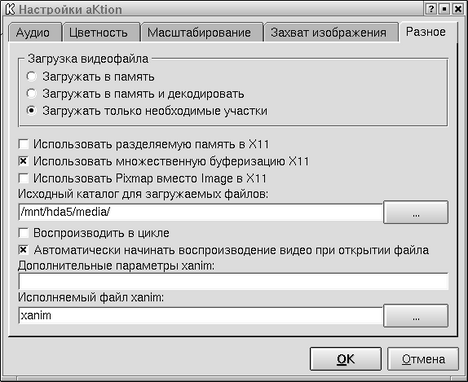 Рис. 15.33. Окно настроек программы aKtion Далее идет строка ввода, в которой можно указать, с какого каталога будет начинаться поиск нужного видео-файла (если строка пуста, то начальной точкой поиска будет ваш домашний каталог). Вы можете ввести полное имя нужного каталога или выбрать его, нажав кнопку справа с тремя точками. Ниже строки, задающей начальный каталог, идут два параметра, назначение которых очевидно из названий: Воспроизводить в цикле и Автоматически начинать воспроизведение видео после открытия файла, а затем две строки ввода для задания местоположения файла программы xanim и ее параметров. На вкладке Аудио особых пояснений требует только одна опция: Пропускать кадры для синхронизации видео и звука. Эта опция необходима при работе на медленных машинах, на которых видео и аудио могут воспроизводиться с разной скоростью (изображение отстает от звука). В таком случае надо включить данную опцию. Это приведет к снижению качества воспроизведения изображения, поскольку часть кадров видео будет пропускаться, но результат может быть вполне приемлемым (все зависит от скорости процессора и объема памяти в компьютере). Выключение параметра Показывать уровень громкости приводит к исчезновению ползунка регулятора громкости в основном окне программы, а переключатель Начальная громкость задает уровень громкости, устанавливаемый при запуске программы. Вкладка Цветность содержит некоторые параметры, менять которые может оказаться необходимым в тех случаях, когда Ваш дисплей не позволяет воспроизводить True Color (16-битные цвета). По умолчанию здесь задано отсутствие преобразований цвета ("Нет"). Установка значений, больших 1.0, в последней строке вкладки ("Гамма дисплея") приводит к тому, что изображение становится ярче. Вкладка Масштабирование позволяет выбрать режим вывода изображения: от половинного до полноэкранного. Программа aKtion предоставляет возможность сделать снимок экрана в процессе вывода видео, для чего надо в нужный момент нажать клавишу <C>. Вкладка Захват изображения позволяет задать формат файла с захваченным изображением и указать каталог, в котором этот файл будет сохранен. Возможны следующие форматы выходных файлов: bmp, jpeg, pbm, pgm, png (используется по умолчанию), ppm, xbm, xpm. Поскольку aKtion является просто оболочкой к программе xanim, то список поддерживаемых форматов видео-файлов вы можете просмотреть по команде man xanim. К сожалению, с помощью aKtion удается просмотреть далеко не любой видео-файл. По крайней мере мне не удалось с ее помощью просмотреть два недавно приобретенных CD-диска с фильмами в формате MPEG4. А вот программа xine из дистрибутива ASP Linux 7.2 с ними справилась. Программа XineАудио/видео проигрыватель xine (произносится «кси:н» с долгим «и») предназначен как для воспроизведения отдельных аудио или видео-потоков (т.е. файлов .mp3 или .mpv), так и avi-файлов (используя win32-кодеки), а также фильмов в формате видео-CD (VCD), SVCD и DVD (незащищенных от копирования, для воспроизведения защищенных DVD-форматов требуется установить дополнительный плагин). Домашняя страница программы находится по адресу http://xine.sourceforge.net, а rpm-пакет можно найти на http://rufus.w3.org. Программа рассчитана на воспроизведение следующих мультимедиа-форматов.