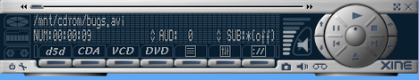 Рис. 15.35. Панель управления программы xine. Если вы, например, хотите воспроизвести VCD или DVD, то после появления на экране панели управления щелкните кнопкой мыши по кнопке с надписью VCD (или DVD). Это заставляет Xine искать диск в соответствующем устройстве. Если диск найден, вы можете запустить воспроизведение щелчком по кнопке с изображением треугольника в верхней части круглой «ручки» на правой стороне панели.