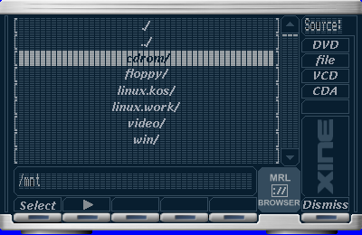 Рис. 15.36. Выбор файла для воспроизведения. Если же вы хотите воспроизвести фильм, который находится в файле на жестком диске или CD, надо сначала добраться до нужного файла. Для этого нужно открыть окно MRL-браузера (рис. 15.36), что достигается щелчком по кнопке на панели управления, над которой изображен значок “://”. Аббревиатура MRL означает Media Resource Locator, то есть указатель медиа-ресурса(ов). В качестве такого указателя могут выступать:
