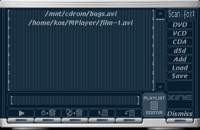 В окно MRL-браузера вы вначале должны выбрать тип источника, щелкнув левой кнопкой мыши по одной из кнопок в поле окна, обозначенном словом «Source». Не могу вам сказать, что произойдет после выбора VCD, DVD или CDA – не было у меня дисков в этих форматах. Если же вы выберите вариант file, то в основном поле окна отобразится содержимое текущего каталога. Дальше можно перейти в любой каталог вашей файловой структуры (в том числе в каталог, куда смонтирован CD-ROM) и выбрать файл для воспроизведения. Проще всего переходы по структуре каталогов осуществлять, щелкая мышью по нужному каталогу (чтобы переместить на него подсветку), а затем щелкая по кнопке Select. Когда вы уже добрались до нужного файла и переместили на него подсветку, нужно вместо Select щелкнуть по кнопке с изображением треугольника. Начнется показ выбранного фильма в окне просмотра. Если же после выбора файла щелкнуть по кнопке Select, то для начала воспроизведения придется воспользоваться упоминавшейся выше кнопкой панели управления с изображением треугольника. Окно MRL-браузера можно закрыть щелчком по кнопке Dismiss. Можно также одним щелчком правой кнопки мыши по свободному полю в окне просмотра разом закрыть все вспомогательные окна (включая окно панели управления). Тот же эффект достигается нажатием клавиши <G> (обратно на экран они вызываются тем же способом). Все фильмы (или файлы), которые вы просматривали в текущем сеансе работы с программой, запоминаются в списке просмотренных фильмов (или плей-листе – playlist). Этот список можно просмотреть в отдельном окне (рис.15.37), которое называется Playlist Editor. Вызвать его на экран можно щелчком по четвертой слева кнопке на панели управления xine. В список можно добавлять фильмы (кнопка Add справа) или удалять из него как отдельные позиции, так и весь список разом с помощью кнопок в нижней части окна (всмотритесь в изображения над кнопками и вы поймете из назначение). Можно также сохранить список фильмов (кнопка Save) или загрузить ранее сохраненный список (кнопка Load в правой стороне окна).