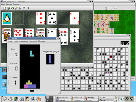 Программа поддерживает чтение из входного потока (stdin), или из сети по протоколу HTTP. MPlayer в основном подпадает под условия лицензии GPL, но содержит и код, который распространяется на других условиях, в частности, библиотеку OpenDivX, которая имеет специальную лицензию. Разработчики поставляют эту программу только в исходных кодах, заявляя, что ее распространение в бинарных кодах пока невозможно как по техническим, так и по юридическим причинам. Более подробное описание программы MPlayer я не могу привести, поскольку узнал о ней на самом последнем этапе работы над данной книгой и не успел ее установить и освоить. Однако я посчитал необходимым привести упоминание о ней, учитывая положительные отзывы в листах рассылки. В заключение раздела остается только сказать, что, как показывают приведенные описания, уже сейчас (несмотря на то, что разработка упомянутых в этом разделе программ еще не завершена) имеются вполне работоспособные программные средства для воспроизведения видео под Linux. 15.8.3 ИгрыКонечно, далеко не каждый пользователь компьютера тратит много времени на компьютерные игры, но вряд ли найдется такой из нас, кто никогда не запускает их в свободную минуту. Почему-то широко распространено следующее мнение: "Linux — это операционная система для программистов. Если вы хотите играть, запускайте Windows!". Однако это далеко не так и я попытаюсь обосновать это утверждение в настоящем разделе. Минимальный набор игр и развлечений включен в состав графической среды KDE. Я лично, вполне довольствуюсь тем, что там есть, и даже всего тремя играми (рис. 15.40): Тетрис, Маджонг и Пасьянс. Но для настоящего игрока этот набор, конечно, покажется очень бедным. Впрочем, стандартный набор игр, входящий в состав Windows, еще беднее. "Настоящие" игры — это, по мнению большинства, игры трехмерные, похожие на видео-фильмы, главным действующим лицом в которых является играющий. Но такие игры требуют хорошей видео-карты и программной поддержки трехмерной графики. Третья версия пакета XFree86, содержала лишь код, необходимый для 2D-приложений. Чтобы играть в 3D-игры, нужно было добавлять специальное ПО. В четвертую версию пакета XFree86 включен быстродействующий механизм трехмерной графики. Кроме того, была разработана открытая спецификация OpenAL, которая обеспечивает в играх поддержку 3D-аудио. Точно так же, как переход Microsoft с DirectX 5 на DirectX 6 изменил ситуацию для разработчиков игр под Windows, переход от версии 3 к версии 4 XFree86 с добавлением OpenAL и других разработок позволил перенести под Linux самые популярные игры, ранее существовавшие только в Windows-версиях, а также и разработать новые. Рис. 15.40. Игры из стандартного набора KDE Одна из самых известных игр, — Doom, созданная компанией id Software, впервые была опубликована в конце 1993 года. В этой игре вы должны пройти сложный лабиринт, сражаясь с фантастическими монстрами, которые стремятся вас "убить". Существуют сетевые версии этой игры. Первоначально выпущенная для MS-DOS, DOOM была затем перенесена на NeXT, SGI, Macintosh-и, Atari Jaguar, MS Windows. Первая версия для Linux была разработана Дэвидом Тейлором (David Taylor). В декабре 1997 г. id Software выпустила DOOM под лицензией GNU General Public License. Вы можете найти версию этой игры под названием LxDoom по адресу http://lxdoom.linuxgames.com/current.html. Еще в 1995 году была начата разработка проекта FreeCiv — клона популярной игры Civilization. FreeCiv обеспечивала режим коллективн