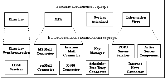 Реализовано как сервис MSExchangeIS; Реализован как сервис MSExchangeSA. Останов этого сервиса приводит к останову всех остальных сервисов Exchange. Служба каталога и оба хранилища опираются на расширенную версию СУБД Jet Engine, поддерживающую хранение текстовых данных в формате UNICODE, объектов OLE, назначение списков привилегий на объекты, механизм транзакций и выполнение операций резервного копирования в процессе работы. Поддержка операций отката и повторного выполнения гарантирует восстановление системы в случае сбоев. Каждая из трех служб использует собственный набор файлов данных, состоящий из одного файла хранилища и минимум пяти файлов журнала. Предельный размер информации для каждого из хранилищ - 16 Гб (последующие версии Exchange будут поддерживать хранилища до 16 Тб). Журналы транзакций могут заполняться в двух режимах: обычном и циклическом. В обычном режиме после исчерпания пространства в текущем наборе журнальных файлов автоматически создается новый набор. Для каждого набора Exchange Server использует пять файлов размером 5 Мб. Старые журналы транзакций сохраняются до тех пор, пока не будет выполнена операция полного резервного копирования хранилища. При циклическом заполнении, как правило, используется только один набор журнальных файлов, что позволяет существенно экономить место на диске. Однако в случае большой нагрузки сервер может автоматически создавать дополнительные журнальные файлы. Этот режим используется сервером по умолчанию, однако, в этом случае невозможно выполнение резервного копирования обновлений (Incremental backup) и разностного копирования (Differential backup). По умолчанию информационное хранилище каждого сервера обслуживает как почтовые ящики пользователей, так и общие папки. Для экономии ресурсов, оптимизации производительности и балансировки нагрузки в пределах площадки каждый конкретный сервер может быть настроен на выполнение только одной из указанных функций. К вспомогательным компонентам относятся: