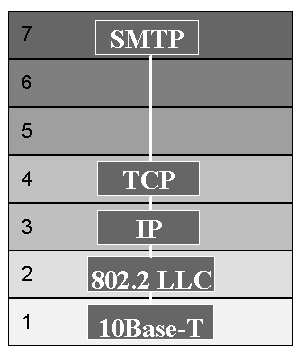 Рис. 1.5. SMTP протокол в терминах модели OSI Отсутствие поддержки других сетевых протоколов, однако, не помешало SMTP получить очень широкое распространение. В связи с бурным ростом Internet, на сегодняшний момент SMTP, как протокол передачи сообщений, приобрел статус стандарта де-факто. Практически все производители пакетов электронной почты либо поддерживают протокол SMTP как базовый, либо на уровне шлюзов. В большой степени такая популярность объясняется сравнительной простотой реализации и широкими возможностями расширяемости без ущерба для обратной совместимости с существующими версиями почтовых систем. Немаловажным фактором является также широкая доступность спецификаций и отсутствие необходимости отчислять средства за их использование. SMTP-системы за последнее время активно развивались в следующих направлениях:
