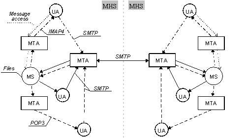 Начальная версия протокола SMTP поддерживала ограниченный набор команд и сервисов для приема и передачи сообщений. В последнее время был разработан его расширенный вариант (Extended или ESMTP), обеспечивающий стандартную возможность дальнейшего расширения и поддержку таких функций как подтверждение доставки (Delivery Notification Request или DNR), согласование максимального допустимого размера сообщений, передаваемых между серверами и принудительная инициация передачи накопленной почты (dequeue). Однако одной из слабых сторон на данный момент SMTP было и продолжает быть отсутствие возможности аутентификации входящих соединений, шифрования диалога и потока передачи данных между серверами. Отсутствие средств аутентификации входящих соединений не позволило использовать SMTP для обслуживания клиентского доступа. Классическая почтовая SMTP-система требует наличия файлового доступа клиента к своему почтовому ящику для получения и работы с сообщениями. Для реализации работы в режиме клиент-сервер был создан протокол обслуживания почтового офиса (Post Office Protocol или POP). Наиболее удачной оказалась версия POP3, широко используемая в современных SMTP-системах. Наиболее продвинутые реализации поддерживают аутентификацию с шифрованием имени и пароля и шифрование трафика по протоколу Secure Socket Layer (SSL). Однако, при использовании протокола POP3 отсутствует возможность просмотра характеристик сообщения без предварительной загрузки его на станцию клиента. Для решения проблемы просмотра и манипуляции свойствами почтового сообщения непосредственно на сервере, а также преодоления ряда других функциональных ограничений был разработан протокол IMAP4, его поддержка в большинстве коммерческих систем ожидается в ближайшем будущем. Следует заметить, что как для случая использования классического клиента (команда mail), так и для случая применения POP3 или IMAP4 отправка подготовленных клиентом сообщений требует наличия сервера SMTP. На рисунке 1.6 приведена схема представления типичной SMTP-системы, использующей как традиционный для ОС UNIX файловый метод доступа к почтовому ящику, так и доступ по протоколам POP3 и IMAP4. Изначально SMTP-системы рассчитывались на передачу информации исключительно в текстовом виде и не были ориентированы на передачу символов национальных алфавитов, т.е. использовали 7-битный набор символов. Для решения проблемы передачи двоичных файлов был разработан стандарт UUENCODE, позволяющий внедрять предварительно преобразованные из бинарного в текстовый вид произвольные данные непосредственно в текст сообщения. Однако всеобъемлющим данный подход назвать было трудно, ибо в общем случае никакой информации о природе вложения (типе передаваемых данных и породившем их приложении) принимающая сторона не имела. По мере расширения сети Internet, усложнения программного обеспечения и активного внедрения мультимедиа назрела необходимость создания универсального формата типизации и представления двоичных данных и текста, содержащего национальные символы. Таким универсальным форматом стали многофункциональные расширения почты Internet (Multipurpose Internet Mail Extensions или MIME). Формат MIME оказался чрезвычайно удачным, поскольку в него были заложены возможности неограниченного расширения, как поддерживаемых типов данных, так и национальных кодировок.