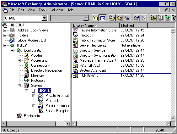 2.5. Средства администрирования2.5.2. Средства мониторинга серверов и трассировки сообщений 2.5.3. Расширенная диагностика 2.5.4. Средства резервного копирования Удобные и мощные средства администрирования являются одним из немаловажных факторов при выборе системы электронной почты уровня предприятия. 2.5.1. Административная консоль ExchangeАдминистративная консоль сервера Exchange является местом централизованного управления почтовым пространством организации. С ее помощи администратор локальной площадки может выносить изменения в обслуживаемый ею фрагмент каталога организации или просматривать информацию в той части каталога, которая обслуживается другими площадками. При наличии соединения и соответствующих прав в дополнительных окнах могут быть доступны для управления фрагменты каталога других площадок. Для управления каждой площадкой достаточно подключения к одному из входящих в ее состав серверов. Административная консоль имеет интуитивно понятный интерфейс, аналогичный тому, что используется в программе Explorer. Каждое из управляющих окон разделено на две части, где в левой отображаются выстроенные в иерархию контейнеры каталога, а в правой - объекты, вложенные в эти контейнеры.