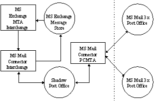 Коннектор MS Mail for PC Networks входит в редакцию Enterprise сервера Exchange и устанавливается как одна из опций в процессе инсталляции. Создание экземпляров коннекторов MS Mail и их последующая настройка выполняются из административной консоли Exchange. Архитектура коннектора MS Mail поясняется рисунком 3.2. Поддерживаются версии MS Mail 3.0 for PC Networks и выше и MS Mail for AppleTalk.