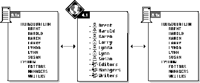 В результате любой пользователь NetWare 3.1x может обращаться на любой другой сервер NetWare 3.1x, который является частью единого кластера NetSync. (Доступ к файлам по прежнему контролируется при помощи прав опекуна, которые, как и раньше, должны назначаться непосредственно на каждом сервере.) После инсталляции NetSync пользователи и группы, указанные в предыдущем примере, распределятся следующим образом: Figure 1-3. Пользователи и группы после инсталляции NetSync Синхронизация BinderyОбычно синхронизацию баз данных Bindery серверов NetWare 3.1x с Каталогом NetWare 4 требуется осуществлять только один раз, когда сервер NetWare 3.1x впервые подключается в среду NetSync. Обновление Bindery контекста NetWare 4 на серверы NetWare 3.1x происходит затем автоматически и постоянно, каждый раз, когда происходит изменение объектов в контексте Bindery на сервере NetWare 4. Всякий раз, когда сервер NetWare 3.1x включается после простоя, сервер NetWare 4 загружает на него контекст Bindery. Благодаря этому сервер 3.1x синхронизируется с изменениями, произошедшими с контекстом Bindery за время его простоя. Использование NETADMIN вместо SYSCONПосле синхронизации все изменения, касающиеся пользователей и групп на сервере NetWare 3.1x, следует делать при помощи NETADMIN или NetWare Administrator. Все изменения, произведенные таким способом, автоматически распространяются на все серверы в кластере NetSync. WARNING: Любые изменения, сделанные при помощи утилит администрирования NetWare 3.1x (таких как SYSCON) на сервере NetWare 3.1x, не копируются на другие серверы в кластере, и, следовательно, синхронизация на вашем сервере будет нарушена. Поэтому используйте SYSCON только для управления учетом системных ресурсов на каждом сервере NetWare 3.1x. (Изменение учета системных ресурсов не поддерживается с помощью NetSync.) Если после инсталляции NetSync вы используете SYSCON для изменения информации о пользователе и группе пользователей на сервере NetWare 3.1x и желаете синхронизировать эту информацию, то обязаны перекопировать информацию Bindery на сервер NetWare 4. (Смотрите "Копирование Bindery сервера NetWare 3.1x на сервер NetWare 4".) Несколько серверов NetWare 4 в Bindery контексте NetSyncЕсли вы имеете несколько серверов с одинаковым контекстом Bindery под управлением NetSync, то все подсоединенные к хостам серверы NetWare 3.1x синхронизируются с одной и той же супер-Bindery. Например, пусть пять серверов имеют одинаковый контекст Bindery. На всех пяти серверах запущен NetSync, и каждый из них имеет двенадцать подсоединенных серверов NetWare 3.1x. Все 60 серверов NetWare 3.1x загружают их Bindery в контекст Bindery NetWare 4, и затем общий контекст Bindery выгружается на эти 60 серверов NetWare 3.1x. Хотя верхний предел на количество серверов NetWare 4 на один контекст Bindery не установлен, однако следует иметь в виду, что NetSync довольно интенсивно использует память и процессор. Чем больше объектов синхронизируется, тем больше загруженность сервера. Перемещение серверов печатиПри помощи NetSync, вы можете переместить все серверы печати NetWare 3.1x и объединить их в один сервер печати на сервере NetWare 4. Существующие очереди печати имеют то же представление для пользователей, но теперь обслуживаются при помощи сервера печати NetWare 4. Старые утилиты печати NetWare 3.1x автоматически заменяются утилитами печати NetWare 4, которые копируются на сервер NetWare 3.1x. Для получения большей информации по печати NetSync смотрите "Поддержка печати в NetSync". Какие объекты синхронизируютсяNetSync синхронизирует следующие объекты
