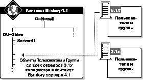 NOTE: NetSync зависит от установки контекста Bindery на сервере NetWare 4, и этот контекст Bindery должен оставаться неизменным. Контекст Bindery, установленный для NetWare 4 по умолчанию есть контейнер, в котором инсталлирован сервер. Однако для NetSync вы можете установить контекст Bindery в любой контекст Каталога; объект Сервер NetWare 4 не должен являться частью этого контекста Bindery. Более подробно об инсталляции контекста Bindery смотрите раздел "SET" в книге Справочник по утилитам. Все Bindery и NDS объекты Пользователь и Группа, находящиеся в Bindery контексте NetWare 4, собираются вместе и копируются на каждый сервер NetWare 3.1x. Каждый сервер NetWare 3.1x получает копию этой "супер-Bindery", как показано на рисунке ниже. Figure 1-2. Супер-Bindery копируется на серверы NetWare 3.1x