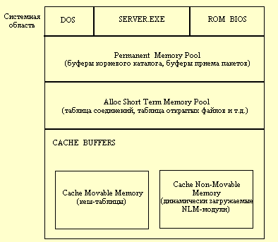 Распределение и защита основной памятиНа рисунке 2.5 представлена структура оперативной памяти файлового сервера NetWare 3.х. Структура ОП для NetWare 4.х отличается тем, что области памяти Permanent Memory Pool и Alloc Short Term Memory Pool объединены в один пул Allocated Memory Pool. В системной области располагаются ОС DOS, модуль SERVER.EXE, программы BIOS. В пулах памяти хранятся буферы приема пакетов, таблица соединений, таблица открытых файлов, блоки, динамически выделяемые NLM-модулям, и т.д. Всю оставшуюся память занимает кэш-буфер (Cache Buffers). В этой области выделяются кэш неперемещаемой памяти (Cache Non-Movable Memory) и кэш перемещаемой памяти (Cache Movable Memory). В кэше перемещаемой памяти в основном хранятся кэш-таблицы, которые могут быть перемещены операционной системой в другое место ОП в случае возникновения фрагментации памяти. Кэш неперемещаемой памяти расширяется, если в ОП загружается NLM-модуль. NLM-модули не являются перемещаемыми. После выгрузки NLM-модуля из ОП освободившаяся память вновь возвращается в кэш-буфер.