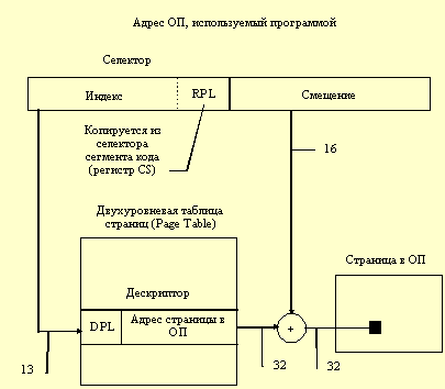 ![]() Рис. 2.5. Структура ОП файлового сервера NetWare 3.x В NetWare 3.х защита оперативной памяти не предусмотрена: любой NLM-модуль имеет доступ к любой области ОП. Поэтому в NetWare 3.х нельзя отлаживать новые NLM-модули на работающей системе, т.к. ошибка в программе может привести к "зависанию" всей системы. NetWare 4.х предусматривает кольцевую и доменную защиту ОП на основе сегментации и страничной организации процессоров Intel 80386/80486. Прежде всего рассмотрим, как процессор выполняет обращение к ОП из программы файлового сервера NetWare 4.х (рисунок 2.6). Адрес ОП состоит из селектора и смещения. 13-битовый индекс селектора определяет дескриптор в таблице страниц. Из этого дескриптора извлекается 32-битовый адрес требуемой страницы в ОП и к нему прибавляется 16-разрядное смещение. В результате получается требуемый физический адрес данных в оперативной памяти. Но перед формированием физического адреса определяется возможность доступа программы к требуемой странице. Для этого в поле RPL селектора адреса копируется 2-битовый уровень привилегий из селектора сегмента кода, загруженного в регистр CS. Таким образом, поле RPL определяет уровень доступа программы к странице. Если значение RPL не превышает значения DPL дескриптора, то программе разрешается доступ к странице. Описанный механизм ограничения доступа называется кольцевой защитой памяти. NetWare 4.х поддерживает только два уровня доступа: 0 и 3 (значения поля RPL). Уровни 1 и 2 эквивалентны уровню 3. В NetWare 4.х самый привилегированный уровень 0 обозначается как OS, а уровень 3 - как OS_PROTECTED. Доменная защита памяти в NetWare 4.х заключается в том, что для каждого уровня доступа (OS и OS_PROTECTED) определена своя двухуровневая таблица страниц (Page Table). Работающий в кольце (домене) процесс не может видеть адреса памяти, не отображённые явно на этот домен. Следовательно, для одного домена логически не существует пространства памяти (адресов) другого домена.
