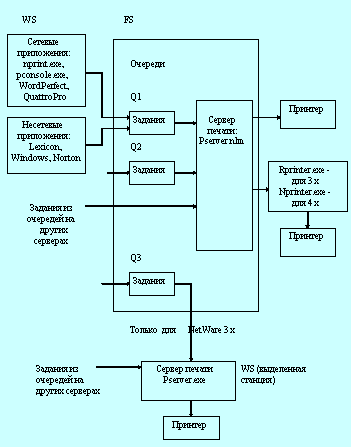 Сетевая печатьВсе клиенты сети могут пользоваться одним или несколькими общими принтерами. На рисунке 2.13 представлена схема организации сетевой печати в NetWare.