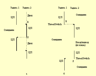 Обработка, которая встречается в многозадачных сетевых операционных системах, основывается на одной из двух моделей использования центрального процессора (ЦП) - модели с приоритетами или модели без приоритетов (невытесняющая многозадачность). Большинство многозадачных сетевых операционных систем, таких, как OS/2 и UNIX, являются системами, где поддерживается модель с приоритетами. Предположим, что в одной из этих ОС выполняются две задачи (рисунок 2.33 а), причём задача 2 имеет более высокий приоритет, чем задача 1. После операции с диском (чтение или запись) операционная система активизирует задачу 2, имеющую более высокий приоритет (рисунок 2.33 а, точка 1). При этом задача 1 прерывается (вытесняется) и переходит в состояние ожидания. Если для задачи 2 требуется выполнить операцию с диском, то операционная система приостановит её и передаёт управление задаче 1 (рисунок 2.33 а, точка 2) и т. д.