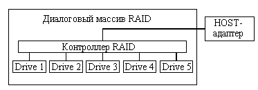 Поддержка дисковых массивов RAIDКогда объём внешней памяти файлового сервера приближается к 10 Гб, то использование традиционных способов обеспечения надёжного хранения данных (см. SFT II) становится проблематичным. В настоящее время для надёжного хранения больших объёмов данных (порядка 10 и более гигабайт) используют дисковые массивы RAID (Redundant Array of Independent Disks), которые представляют собой специальные устройства, подключаемые к файловому серверу по SCSI-интерфейсу. Как правило, в корпусе устройства RAID устанавливают 5 дисков (рисунок 2.49).