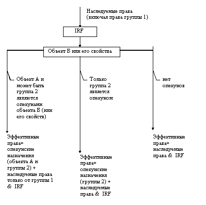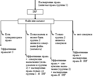 Определения опекуна (Trustees), фильтра наследуемых прав (IRF), наследуемых прав, эффективных прав совпадают с соответствующими определениями для файловой системы. Только понятия файл, каталог, пользователь (группа пользователей) следует заменить соответственно на оконечный объект, контейнерный объект, произвольный объект. Ниже приведены эти определения.