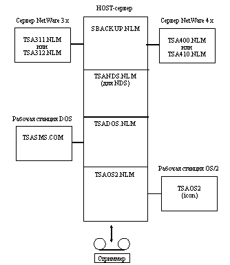 В процессе архивации участвуют host-сервер (сервер NetWare, на котором выполняется программа архивации SBACKUP.NLM) и target-устройство (сервер NetWare или рабочая станция, которые содержат данные для архивации). На рисунке 3.4 представлены те модули, которые должны быть загружены на host-сервере и target-устройствах.