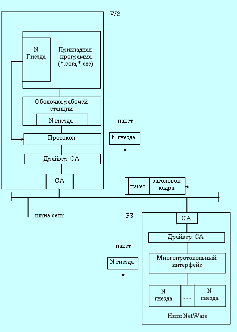Архитектура современных сетевых ОС NetWareПринципы построения и функционированияПринципы организации передачи данных в ОС NetWareNetWare версий 3.х и 4.х построены с использованием одинаковых принципов. Во введении отмечалось, что NetWare относится к классу операционных систем с выделенным сервером. Поэтому на рабочих станциях (WS) и файловом сервере (FS) используются различные операционные системы. Взаимосвязь этих ОС осуществляется посредством кадров, которые передаются по шине, соединяющей станции. Рассмотрим процесс передачи данных или команд от рабочей станции к файловому серверу. С точки зрения организации взаимосвязи с файловым сервером все прикладные программы и утилиты рабочей станции условно можно разделить на два класса: "клиент-файл" и "клиент-сервер". К первому классу ("клиент-файл") относятся программы, выполняющие операции (открытие, ввод/вывод, закрытие) с файлами, которые хранятся на файловом сервере. В DOS при выполнении операций с файлами вырабатывается прерывание 21Н, которое перехватывается оболочкой (запросчиком) рабочей станции (рисунок 2.1). Если файл располагается на локальном диске, то оболочка переадресовывает это прерывание операционной системе рабочей станции. Если файл располагается на файловом сервере, то оболочка открывает так называемое гнездо, используемое в дальнейшем для приема пакетов с файлового сервера. Затем запросчик формирует пакет для передачи его на сервер. Одно из полей этого пакета содержит номер гнезда, совпадающий с номером гнезда нити (задачи) сервера, которая будет обрабатывать этот пакет. Далее оболочка с помощью специальной функции протокола направляет пакет в сеть. При прохождении через драйвер сетевого адаптера (СА) пакет превращается в кадр, т.е. к нему добавляется заголовок и концевик кадра. Именно кадр передаётся по шине сети. Таким образом, оболочка реализует прозрачный доступ прикладной программы к файлу, который хранится на сервере. Т. е. программист может использовать обычные функции ввода/вывода языка С или Ассемблера, не вникая в детали API-интерфейса рабочей станции с файловым сервером. При выполнении операций с файлом в программе, функционирующей под управлением OS/2, реализуются аналогичные действия. Только здесь соответствующее прерывание сначала перехватывается ОС, которая переадресовывает его оболочке. Ко второму классу ("клиент-сервер") относятся программы рабочей станции, непосредственно взаимодействующие с NLM-модулями файлового сервера. Перед передачей пакета NLM-модулю прикладная программа рабочей станции должна открыть гнездо, используемое в дальнейшем для приема пакетов, передаваемых с файлового сервера NLM-модулем. Далее прикладная программа формирует пакет для передачи по сети. Одно из полей этого пакета должно содержать номер гнезда нити, с которой связан соответствующий NLM-модуль. Затем прикладная программа рабочей станции направляет пакет в сеть с помощью специальной функции протокола. При прохождении через драйвер СА пакет превращается в кадр. Таким образом, если программист создал свой NLM-модуль и желает осуществить к нему доступ со стороны рабочей станции, то он должен создать и соответствующую прикладную программу типа "клиент-сервер". При этом программист должен знать детали API-интерфейса.