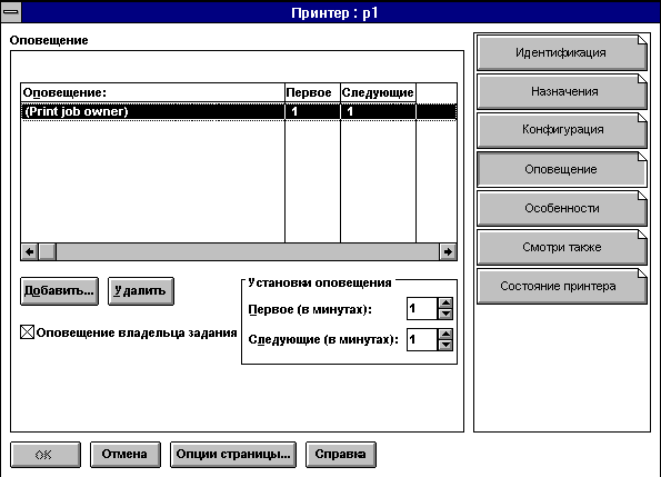 - "Настройки оповещения" - указывает, через какое время (в минутах) после случившегося с принтером будет послано первое оповещение для объекта, определенного в поле "Оповещение", и через какое время (в минутах) после первого оповещения, направленного объекту, будут посылаться следующие оповещения.