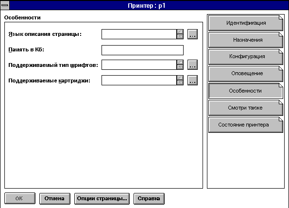Страница принтера "Особенности" позволяет Вам хранить следующую информацию о принтере: