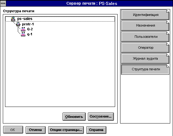 NOTE: Полное графическое представление настройки печати может быть получено при просмотре страницы "Структура печати", доступной в опции "Подразделение" или в диалоге "Сервер печати" в окне просмотра.