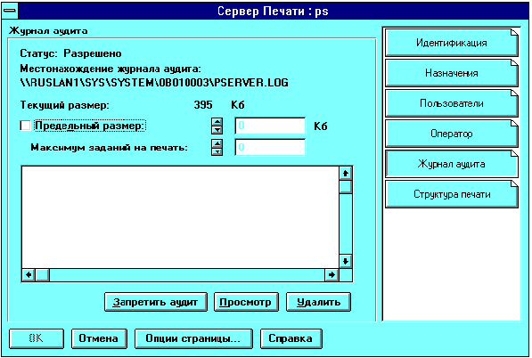 В поле "Предельный размер" Вы должны указать максимальный размер (в килобайтах) файла журнала аудита, в рамках которого сервер печати может добавлять в него информацию. Если этого не сделать, журнал будет пополняться до тех пор, пока не израсходуется все доступное дисковое пространство.