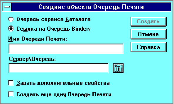 - "Сетевой сервер\очередь" - отображает очередь, которая появится в дереве Каталога, и сервер, на котором определена Bindery-очередь.