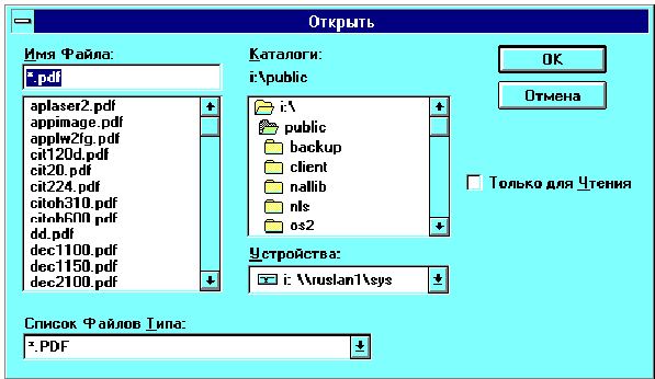 Появится диалог определения печатающего устройства "Открытие файла", аналогичный изображенному ниже, в котором отображается список определений печатающих устройств (файлов .PDF), доступных из текущего каталога.