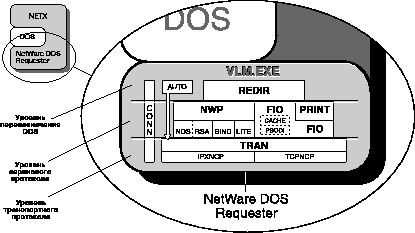Отдельный компьютер, работающий под управлением OS/2 может быть преобразован в клиент OS/2 путем установки в него сетевой платы и инсталляцией программного обеспечения NetWare Client для OS/2. Программа инсталляции NetWare Client копирует программные файлы NetWare Client, динамические библиотеки, драйверы сетевых плат и некоторые утилиты в указанный каталог на вашем компьютере OS/2. Программа инсталляции также модифицирует ваш файл CONFIG.SYS так, что после перезапуска компьютера программное обеспечение NetWare Requester для OS/2 загружается автоматически. См. книгу NetWare Client for OS/2* User Guide. NetWare DOS RequesterНабор файлов, обеспечивающих поддержку NetWare для рабочих станций клиентов, использующих DOS и MS Windows. Эти файлы включают в себя множество программ VLMTM и один исполняемый файл (VLM.EXE), который управляет работой файлов .VLM. Трехуровневая структураФайлы .VLM сгруппированы в три следующих уровня: