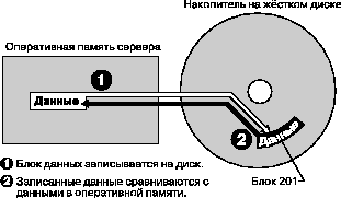 См. также: "Раздел Каталога NetWare", "Реплика Каталога NetWare". Запросчик системы управления хранением данныхStorage Management Data Requester (SMDR) - передает команды и информацию между SBACKUP и Агентами обслуживания цели. См. также: "Система управления хранением данных". Защита данныхСистема мер, направленная на обеспечение сохранности данных в сети. В NetWare для защиты данных обычно применяется дублирование файлов и каталогов, а также перенос данных из сбойных блоков в надежные на томах сервера NetWare. Защита информации о размещении данных на дискеТаблицы DET и FAT жесткого диска содержат информацию о размещении файлов и сообщают операционной системе, в каких местах данные могут быть размещены или считаны. Если блоки, выделенные для размещения этих таблиц разрушатся, то все или некоторые данные могут быть потеряны. NetWare существенно снижает риск потери этой информации поддерживая копии таблиц DET и FAT в раздельных областях диска. При порче одного из блоков таблиц размещения операционная система переключается на использование резервной таблицы для определения местоположения данных. Затем сбойный сектор помечается в таблице плохих блоков диска, а данные размещаются в другом месте диска. При каждом включении сервера операционная система выполняет проверку целостности данных в обеих копиях таблиц DET и FAT для проверки совпадения этих таблиц. При несовпадении таблиц система выдает предупреждение и администратор должен запустить утилиту VREPAIR. Защита данных от дефектов поверхности носителяNetWare хранит данные на дисках в блоках по 4, 8, 16, 32 и 64 КБ. Эти блоки имеют определенное местоположение на поверхности магнитного диска. (В одном томе все блоки данных имеют одинаковый размер). Из-за постоянных обращений на чтение/запись данных на диске некоторые из блоков могут потерять возможность хранить данные. NetWare предотвращает попытку размещения данных в ненадежных блоках, используя для этого механизм проверки чтением после записи и Hot FixTM. Эти методы, иллюстрируемые двумя следующими рисунками, позволяют поддерживать надежность хранения данных на жестком диске на том же уровне, что и сначала при установке и тестировании диска. Проверка чтением после записи. Сразу после записи данных на диск данные прочитываются обратно в оперативную память и сравниваются с оставшимися в памяти исходными данными. Figure 28-1. Проверка чтением после записи