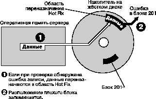 При совпадении данных на диске и в памяти операция записи считается успешной, выделенная для данных область памяти освобождается и выполняется следующая операция ввода/вывода данных на диск. Если считанные данные не совпадают с данными в памяти, операционная система определяет (после выполнения соответствующих тестов), что данный блок диска является дефектным. Процедура Hot Fix переносит запись исходных данных (которые все еще находятся в памяти) в область переназначения Hot Fix, в которой данные могут быть записаны корректно. Область переназначения Hot Fix. Небольшой участок диска резервируется как область переназначения Hot Fix. Эта область диска предназначена для хранения блоков данных, перенаправленных из сбойных блоков. Процедура Hot Fix всегда активна, кроме случаев когда диск является испорченным и не может быть использован, или его область переназначения заполнена. Операционная система запоминает адреса сбойных блоков и больше не пытается использовать их для хранения данных. Figure 28-2. Область переназначения Hot Fix