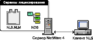 Если вы используете NDS Manager для изменения разделов Каталога по умолчанию, то вы должны обновить копии каталога, сохраняемые на серверах в контексте эмуляции Bindery. Объекты, содержащиеся в контейнерном объекте, для которых установлен контекст эмуляции Bindery, должны иметь совместимые с Bindery имена. Например, полное имя для объекта Пользователь будет иметь вид: MRICHARD.ACCOUNTING.NOVELL US Вместе с тем, клиенты и серверы, использующие сервис Bindery, могут видеть только общее имя объекта Пользователь. Таким образом, общее имя объекта должно удовлетворять правилам именования Bindery. См. также: "Контекст", "Дерево Каталога", "Объект", раздел "Managing the NetWare Directory Tree", в главе 5 книги Supervising the Network. Сервис NetWare MHSСервис, позволяющий пользователям обмениваться электронными сообщениями по сети. Использование сервисов передачи сообщений позволяет пользователям обмениваться электронной почтой, использовать общие календари, программы планирования и прочие продукты. Для обеспечения сервиса управления сообщениями NetWare использует сервер передачи сообщений, объект Список рассылки, объект Группа маршрутизации сообщений, объект Внешний и объект Почтмейстер. Сервис имен NetWareNetWare Name Service (NNS) - сервис имен разработан для обеспечения более прозрачного доступа к ресурсам в сети NetWare. Система NNS является прообразом NDS и состоит из набора специализированных утилит, рассчитанных на работу с существующими сетями NetWare 2 и NetWare 3. Используя NNS, пользователи могли более просто регистрироваться на нескольких файловых серверах и выполнять печать в определенные очереди печати; администраторы сети могли проще управлять пользователями и группами в многосерверных сетях. Система NNS более не поддерживается и не поставляется. See also "Сервис Каталога NetWare". Сервис лицензирования NetWareNetWare Licensing Services (NLS) - распределенный сервис масштаба предприятия, позволяющий администраторам отслеживать и управлять использованием лицензионных программ в сети. NLS тесно интегрирована с технологией NetWare(r) Directory ServicesTM (NDSTM ) и основана на ее архитектуре, ориентированной на сети масштаба предприятия. Эта архитектура включает в себя компоненты для клиентов, использующих различные платформы, и системные компоненты, которые выполняются на серверах NetWare 4.1x. NLS также предоставляет базовые средства измерения использования лицензионных продуктов и библиотеки, позволяющие разработчикам программного обеспечения включать сервис лицензирования в другие продукты. Как изображено на Рис. 54, NLS включает следующие компоненты: