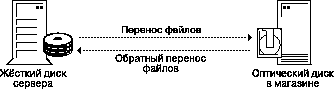 Пользователь должен разрегистрироваться и зарегистрироваться вновь, чтобы изменения вступили в силу. Используемые утилиты: "NETADMIN" и "NetWare Administrator" описаны в книге Справочник по утилитам. Система хранения данных большой емкостиHigh Capacity Storage System (HCSS) - система хранения данных, расширяющая возможности по хранению данных сервером NetWare посредством встраивания в файловую систему NetWare поддержки библиотек оптических дисков (дисководов с автоматической сменой дисков). HCSS выполняет перемещение файлов между быстрыми накопителями данных небольшой емкости (жесткими дисками сервера) и медленными системами хранения данных высокой емкости (оптические диски в дисководе с автоматической сменой дисков). Этот процесс незаметен с точки зрения пользователя; файл как бы продолжает находиться на сервере NetWare. Пользователи и программы получают доступ к хранящимся на оптических дисках файлам и каталогам используя те же команды и функции NetWare, как и при обращении к жесткому диску. HCSS использует перезаписываемые оптические диски, что обеспечивает возможность постоянной записи и стирания данных. Могут использоваться односторонние и двухсторонние диски. Миграция и обратный перенос данныхHCSS использует свободное пространство на сервере для временного кэширования часто используемых файлов, хранящихся в оптической библиотеке. При сокращении свободного пространства на диске до определяемого администратором значения, реже используемые файлы из кэша перемещаются обратно на оптические диски. Этот процесс называется миграцией данных. Когда пользователь обращается к файлу, который был перенесен на оптический диск, система HCSS копирует файл из магазина оптических дисков на жесткий диск сервера. Этот процесс, называемый обратным переносом, позволяет пользователям получать доступ к редко используемым файлам также как и к часто используемым, лишь с небольшой задержкой. Путь файла остается неизменным вне зависимости от того, находится он на жестком диске или на оптическом диске. Ниже на рисунке схематически изображен процесс миграции и обратного переноса файлов. Figure 37-12. Миграция и обратный перенос запрошенного файла