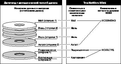 Управление каталогами HCSSКаталог HCSS является каталогом файловой системы, логически группирующим один или более оптических дисков и связанные с ними файлы. Каталог HCSS располагается на томе NetWare, связанном с магазином оптических дисков. Администратор сети может создать один или несколько каталогов HCSS для каждого магазина. Администратор сети должен присвоить уникальные метки каждой стороне каждого оптического диска и назначить каждому оптическому диску каталог домена HCSS. После этого, каждая метка считается каталогом носителя данных в каталоге HCSS. На рисунке ниже изображено соответствие между магнитооптическими носителями и каталогами носителей. Figure 37-13. Группирование носителей в каталоги HCSS