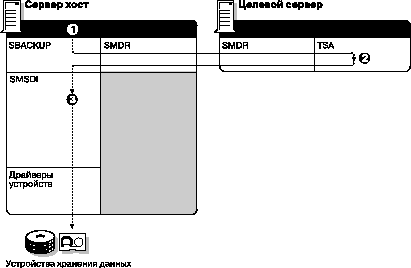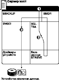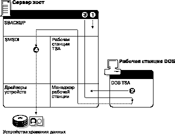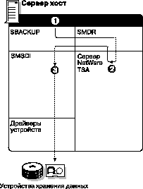 Если бы TTS не сохраняла блокировку записей до завершения транзакции, база данных содержала бы некорректную информацию, поскольку нормальная транзакция станции 2 была бы ошибочно перезаписана данными, которые были до транзакции станции 1. Используемые при решении данных задач утилиты: "FILER", "FLAG", и "SET" описаны в книге Справочник по утилитам. См. также: "Кэш-память". Система управления хранением данныхStorage Management System (SMS) - сервис, позволяющий выполнять резервное копирование и восстановление данных. SMS не зависит от аппаратуры резервного копирования и файловой системы (например, DOS, OS/2, Macintosh, MS Windows, или UNIX). Архитектура SMSКомплект поставки NetWare включает программы NLM, соответствующие спецификации SMS, и другие программы, выполняемые на сервере: