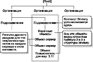 См. также: глава 4, "Инсталляция сервера NetWare для OS/2" в книге Инсталляция, "NetWare Server for OS/2 and NetWare 4" в главе 9 книги Supervising the Network. Сервер печатиСервер, который принимает задания печати из очереди печати и посылает их на сетевой принтер. Сервер печати NetWare работает через программу PSERVER.NLM на сервере NetWare 4 и может поддерживать до 255 принтеров и любое количество очередей печати для этих принтеров. В NetWare 3 сервер печати загружается или с помощью PSERVER.NLM на файловом сервере, или с помощью PSERVER.EXE на выделенной рабочей станции. См. также: глава 6, "Настройка и обслуживание серверов печати", в книге Сервис печати. Сервер по умолчаниюСервер, с которым происходит соединение при загрузке NetWare RequesterTM. Сервер по умолчанию это предпочтительный сервер, который определяется в вашем файле NET.CFG. Сервер-источникСервер, с которого в процессе обновления происходит передача данных, файлов Bindery и другой информации на целевой сервер NetWare 4. См. также"Целевой сервер". Сервис BinderyМеханизм NetWare 4, позволяющий работать в сети NetWare 4 утилитам и клиентам, ориентированным на использование Bindery. Объекты Bindery располагаются в плоской базе данных, в отличие от дерева Каталога, являющегося иерархической базой данных. Сервис Bindery обеспечивают отображение объектов Организация и Подразделение в плоскую структуру Bindery. Все объекты, содержащиеся в контейнерном объекте, являются доступными как для объектов NDS, так и для клиентов и серверов Bindery. Сервис Bindery применяется только к конечным объектам в данном контейнере Подразделение. Контекстом эмуляции Binderyназывается контейнерный объект, для которого установлен сервис Bindery. Вы можете выбрать контекст эмуляции Bindery с помощью команды SET. Можно указать несколько контекстов эмуляции Bindery. Вы можете использовать до 16 контекстов эмуляции Bindery для каждого сервера. (См. раздел "Поддержка сервиса Bindery в среде NetWare 4", глава 8 книги Руководство по сетям NetWare 4.) При установке сервера NetWare 4 в дерево Каталога в контейнерном объекте создается объект Сервер NetWare. По умолчанию для этого контейнерного объекта активируется сервис Bindery и устанавливается контекст эмуляции Bindery. На каждом сервере, для которого вы хотите поддерживать сервис Bindery, должна находиться разрешенная для чтения/записи копия раздела Каталога, в который установлен контекст эмуляции Bindery. Такая копия создается автоматически при установке сервера в новый контекст. Если вы не создаете новый контекст при установке сервера NetWare 4 (то есть, сервер помещается в уже существующий контекст), то программа установки помещает на этот сервер разрешенную для чтения/записи копию раздела Каталога, содержащего этот контекст. Хотя при установке сервера NetWare 4 сервис Bindery разрешен по умолчанию, вы можете запретить его с помощью команды SET. Следующий рисунок изображает сервис Bindery, создаваемый при установке контекста эмуляции Bindery для объекта Подразделение. Figure 37-1. Сервис Bindery в дереве Каталога