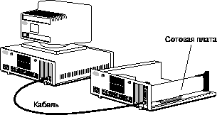 Физическое соединениеДля того, чтобы ресурсы и информация в сети могли использоваться совместно, рабочие станции-клиенты и другие сетевые устройства должны быть соединены физически. В каждом устройстве сети должна быть установлена сетевая плата. К сетевой плате в качестве коммуникационного канала необходимо подключить кабель, как показано на рисунке 1-2 "Сетевая плата и кабельное соединение". Рисунок 2-2. Сетевая плата и кабельное соединение