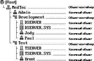 На следующем рисунке показано, как из объектов-контейнеров и конечных объектов образуется дерево Каталога NetWare. Рисунок 2-3. Пример дерева Каталога