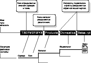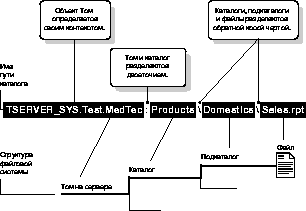 Для того, чтобы определить местоположение объекта в дереве Каталога, используется термин контекст. Контекстом считается позиция объекта внутри его контейнера. Например, на предыдущем рисунке контекстом объекта Пользователь Jody будет Jody.Development.MedTech. Для идентификации объекта нужно знать его контекст. Чтобы облегчить пользователям нахождение объектов, с которыми они постоянно работают, Вы можете настроить файлы конфигурации, указав в них контекст каждого объекта. Это предоставит пользователям возможность более удобного просмотра дерева. Таким образом, пользователям не нужно будет знать точное расположение объектов. Структура файловой системыBindery и сервис Каталога NetWare помогут Вам в управлении такими сетевыми ресурсами, как серверы NetWare и принтеры. Однако они не обеспечивают контроль над файловой системой (тома, каталоги и файлы). Для управления сетевыми ресурсами и файловой системой созданы графические и текстовые утилиты. Структура файловой системы отделена от структуры Bindery или сервиса Каталога NetWare. Физически вся информация сети хранится на жестких дисках, управляемых сервером. Но логически в NetWare 2 и 3 файловая система представлена в виде тома, а в NetWare 4 в виде объекта Том. В NetWare 4 этим томом можно управлять благодаря сервису Bindery. Файловая система состоит из трех типов структур: томов, каталогов и файлов. Файловая структура NetWare 2 и NetWare 3Структура файловых систем NetWare 2 и NetWare 3 начинается с файл-сервера. Физические жесткие диски файл-сервера разделяются на тома, как книжный шкаф на полки. Один том может располагаться на нескольких жестких дисках, или один диск может быть разделен на несколько томов. Каждая каталоговая структура основана на метках томов. Они появляются и действуют подобно корневому каталогу DOS или дисковому устройству. Каталоги хранятся на уровне тома и на уровнях подкаталогов. Файлы хранятся в каталогах и подкаталогах, как они хранятся в операционной системе DOS. На следующем рисунке показано, как работает файловая структура сетей NetWare 2 и 3. Рисунок 2-4. Структура файловой системы и путь к каталогу в NetWare 2 и 3 Файловая структура NetWare 4Файловая структура NetWare 4 начинается с объекта Том. Объект Том - один из типов конечного объекта. Он ссылается на физический том, где хранятся файлы, и позволяет находить файлы сервису Каталога NetWare. Корневой каталог физического тома также представлен как часть объекта Том. Он является наивысшим уровнем в структуре файловой системы. Объект Том обеспечивает связь между сервисом Каталога NetWare и каждым физическим томом файловой системы. Каталоги и файлы не являются объектами дерева Каталога. Доступ к ним внутри дерева Каталога выполняется с помощью объекта Том или с помощью объектов Назначение Каталога. Вы можете облегчить пользователям поиск файлов, настроив объекты Назначение Каталога на указание местоположения конкретного каталога в структуре файловой системы тома. На следующем рисунке показано, как из описанных выше структур строится файловая система сети NetWare 4. Рисунок 2-5. Структура файловой системы и путь к каталогу в NetWare 4