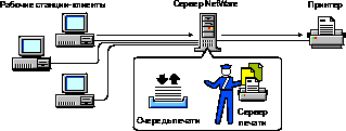 Дополнительная сетевая защита в NetWare 4В дополнение к аналогичным функциям защиты, которые обеспечиваются системами NetWare 2 и 3, в NetWare 4 реализована защита сервиса Каталога NetWare. С помощью защиты сервиса Каталога NetWare контролируется доступ пользователей к объектам и к их свойствам. С помощью прав доступа к объектам контролируются манипуляции опекуна с объектом. Эти права контролируют доступ к объекту как к отдельной части дерева Каталога, но не позволяют обращаться к находящейся внутри этого объекта информации, если не предоставлено право Супервизор для доступа к объектам или свойствам. С помощью прав доступа к свойствам контролируется доступ опекуна к информации, находящейся внутри объекта, а именно, к его свойствам. Каждый объект имеет несколько свойств, доступ к которым контролируется отдельно. Защита с помощью прав организуется путем предоставления объекту опекунских назначений и приобретения им действующих прав через наследование и эквивалентность по правам. Сетевая печатьНесетевая печатьАвтономная рабочая станция может печатать только на принтере, подключенном к одному из ее портов. Задания на печать направляются непосредственно в подключенный принтер. Как показано на рисунке, на подключенном к автономной рабочей станции принтере могут быть распечатаны задания только этой станции. Рисунок 2-6. Автономная печать Сетевая печатьВ сетевой печати принтеры часто используются совместно, поэтому для ее осуществления необходимо выполнить некоторые дополнительные действия: хранение, промежуточную обработку и транспортировку между различными областями обработки. Эти действия могут влиять на маршрут прохождения задания на печать и время, затрачиваемое на передачу задания на принтер. Чтобы несколько рабочих станций сети могли печатать на одном сетевом принтере, в NetWare используются очередь печати, сервер печати и драйвер принтера. Сервер печати выбирает задания из очереди печати и направляет их в принтер. Данный процесс изображен на следующем рисунке. Рисунок 2-7. Сетевая печать