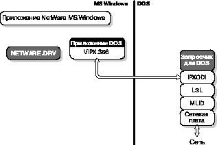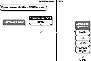 На следующем рисунке показан драйвер MS Windows NETWARE.DRV, транслирующий запросы между MS Windows и DOS. Рисунок 3-3. Доступ к сети из приложений MS Windows
