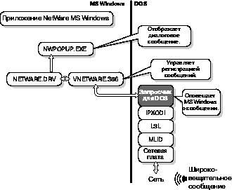 Например, если Вы работаете с MS Windows в расширенном режиме и для перехода в окно DOS и проверки своей электронной почты выбираете пиктограмму DOS Prompt, Ваша рабочая станция-клиент использует этот файл. Прием широковещательных сообщенийНа следующем рисунке показано использование виртуального драйвера устройства, VNETWARE.386, который работает с драйвером NETWARE.DRV и программой NWPOPUP.EXE для координации и отображения диалогов сообщений. Рисунок 3-6. Прием широко-вещательных сообщений