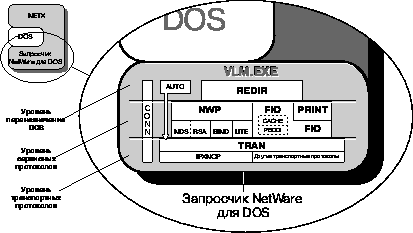Каждый из загруженных компонентов клиента NetWare для определения значений параметров программного обеспечения использует файл NET.CFG. Информацию об этом смотрите в главе 2 "Справочник опций NET.CFG" руководства NetWare Client для DOS и Windows. Технический справочник. Архитектура запросчика NetWare для DOSЗапросчик NetWare для DOS состоит из группы файлов, обеспечивающих поддержку NetWare для рабочих станций DOS и MS Windows. Эти файлы представляют собой ряд виртуальных загружаемых модулей (VLM - Virtual Loadable ModuleTM) и один исполнимый модуль (VLM.EXE), управляющий работой файлов .VLM. Для всестороннего понимания архитектуры запросчика NetWare для DOS необходимо знание этих компонентов, рассматриваемых в следующих подразделах: