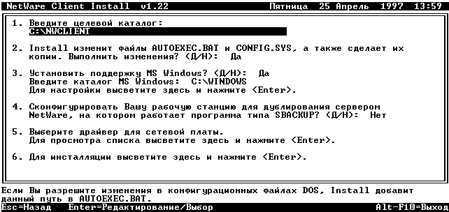 Программа инсталляции клиента NetWare копирует NetWare DOS RequesterTM (запросчик NetWare для DOS) и другое программное обеспечение клиента NetWare для DOS и Microsoft (MS) Windows в определенные каталоги на каждой рабочей станции-клиенте. Кроме того, она обеспечивает процедуры редактирования файлов конфигурации для запуска NetWare в соответствии со средой передачи.