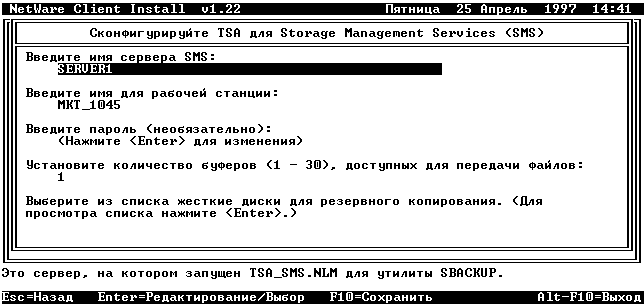 Конфигурирование программного обеспечения TSA на рабочих станциях-клиентах позволяет утилитам, ориентированным на архитектуру SMSTM (таким, как утилиты NetWare SBACKUP или NetWare NavigatorTM), осуществлять доступ к ресурсам рабочей станции для централизованного управления сетью.