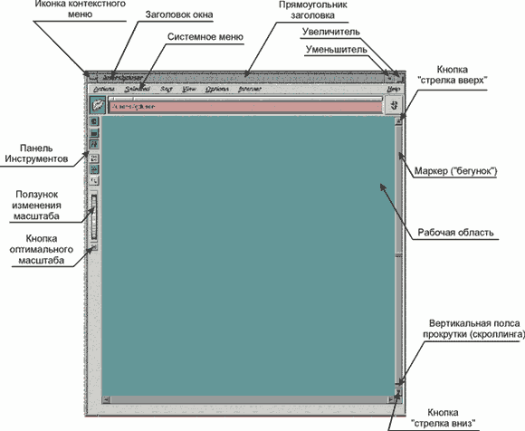 При ее выборе мышью происходит закрытие окна и завершение приложения. 4) Системное меню (menu bar) и 5) Панель управления (toolbar) предназначены для управления работой приложения. Они расположены сразу за прямоугольником заголовка окна. 6) Строка состояния (status bar) в левом нижнем углу окна, предназначена для вывода дополнительной информации о работе приложения и назначения пунктов меню и кнопок. 7) Линии прокрутки (scroll bar ) позволяют осуществить просмотр документа, который не умещается в окне. Они бывают горизонтальными (в нижней части экрана) и вертикальными (в правой его части). 8) (Только IRIX) Ползунок для изменения масштаба изображения содержимого рабочей области. С его помощью можно увеличивать и уменьшать изображение текста, иконок, рисунка в рабочей части окна. Этот ползунок расположен на левой боковой границе окна. 9) (Только IRIX) Кнопка приведения масштаба изображения рабочей области к ее размерами (Zoom). Эта кнопка позволяет подобрать такой масштаб изображения, который обеспечивает размещение всего текста или рисунка в рабочей области без полос прокрутки, и при этом размер этой области был бы максимальным. Эта кнопка расположена ниже ползунка изменения масштаба на левой боковой границе окна. B.2.2.4.5. РезюмеВ этом разделе Вы познакомились с основными и не основными элементами окон. Вы ознакомились с внешним видом этих элементов, их местоположением. Основные приемы работы с окнами и использование этих элементов в ежедневной работе будет описано в разделе B.2.3. Примеры окон в различных операционных системах приведены на рисунках ниже.