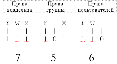 Рис. E.17. Образование маски из атрибутов. Первое восьмеричное число задает права доступа для пользователя, второе - для группы, третье - для остальных пользователей. Пример: chmod 754 texts - установка для файла texts всех прав доступа для пользователя, чтение и выполнение - для группы и только чтение - для всех остальных. Все остальные опции сбрасываются. Примечание. Команда chmod, запущенная абсолютным методом, меняет все права доступа по указанной маске. Ее нежелательно использовать, если необходимо изменить не все, а, например, один атрибут. Назад | Содержание | Вперед