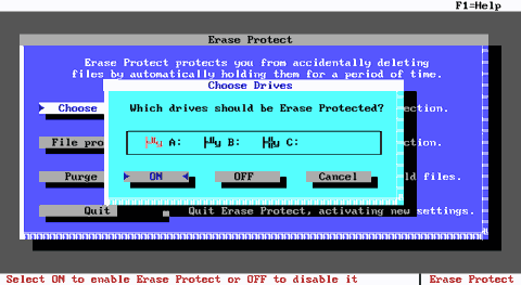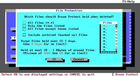 Рис. E.15. Окно параметров защиты программы Erase Protect. Вторая кнопка называется "File protection " и вызывает диалоговое окно, в котором устанавливаются параметры защиты файлов (тип файлов, расширения, атрибут "архивный" и т.п.) Третья кнопка называется "Purge files " и предназначена для удаления некоторых или всех файлов из директории EP. При ее нажатии появляется соответствующее диалоговое окно.