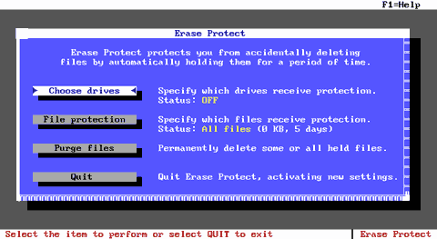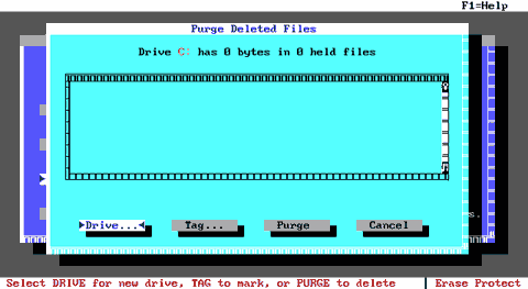 Рис. E.12. Окно принудительного удаления файлов программы SmartCan Кнопка "Purge..." открывает диалоговое окно, в котором можно принудительно удалить все или некоторые файлы из созданной директории. Оно содержит список файлов в директории и кнопки для их удаления. Указанные установки записываются в файл SmartCan.ini . Программа с установками по-умолчанию запускается автоматически из командной строки программой: smartcan /ON Как видно из описания этой программы, она позволяет осуществить "дежурное" удаление файлов не только на локальных дисках с FAT16, но и на сетевых дисках, работающих под управлением Novell NetWare и Microsoft Windows NT! Однако применимость этой программы ограничивается рабочими станциями под управлением MS-DOS и Microsoft Windows 3.1x. (А жаль!). E.2.6.2.4. Программа Erase Protect.Исходя из документации, программа Erase Protect осуществляет те же операции, что и программа SmartCan, но занимает при этом меньше памяти и лишена многих ее настроек и возможностей. Ее интерфейс более приближен к той же реализации "дежурного" сохранения, принятому в графическом интерфейсе. Программа Erase Protect (ep) создает в корневом каталоге защищаемого диска скрытый каталог EP, в который она помещает удаленные системой файлы. Для запуска программы с параметрами по-умолчанию необходимо ввести следующую команду: ep /ON Параметры настройки по-умолчанию находятся в файле ep.ini . Изменить их можно, вызвав программу ep без параметров.