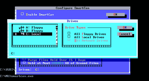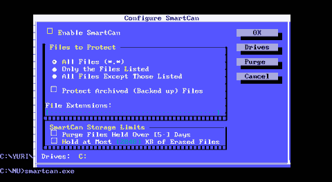 Рис. E.10. Главное окно программы SmartCan Слева расположен флажок Enable SmartCan - включение режима отслеживания удалений. Далее расположены переключатели, которые указывают на защищаемые файлы. Их значения: - All Files - защищаются все файлы. - Only the File Listed - только файлы, указанные в списке. - All Files Except Thouse Listed - все файлы, кроме указанных в списке. Далее находится флажок, который разрешает защищать от удаления файлы с установленным атрибутом "архивный". Затем располагается собственно список файлов. Еще ниже расположены флажки, которые определяют параметры защиты файлов. Первый флажок, установленный по-умолчанию, разрешает программе автоматически удалять из директории файлы, имеющие "срок удаления" более пяти дней (этот срок можно менять). Установка второго флажка (сброшенного по-умолчанию) ограничивает размер директории в <n> килобайт. Справа от этих элементов управления находятся четыре кнопки: OK , Drives , Purge и Cancel . Выбор кнопки " Cancel " отменяет все изменения и приводит к выходу из программы. Выбор кнопки " OK " приводит к сохранению новых настроек и выходу из программы. Назначение других кнопок рассмотрим по-подробнее.